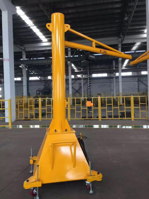 移动式悬臂吊采取的是加厚底座钢板的方式对其平衡性进行调整,因为悬臂吊的失衡主要来自于吊臂偏于一侧的力,而这个力是与悬臂吊的底座相抗的,一旦这个偏向力过大就会导致悬臂吊倾倒。